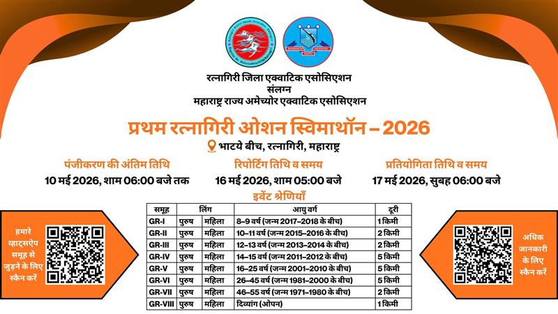 हमें यह घोषणा करते हुए प्रसन्नता हो रही है कि प्रथम रत्नागिरी ओशन स्विमाथॉन – 2026, का आयोजन रविवार, 17 मई 2026 को महाराष्ट्र के सुंदर समुद्र तट रत्नागिरी में किया जाएगा।